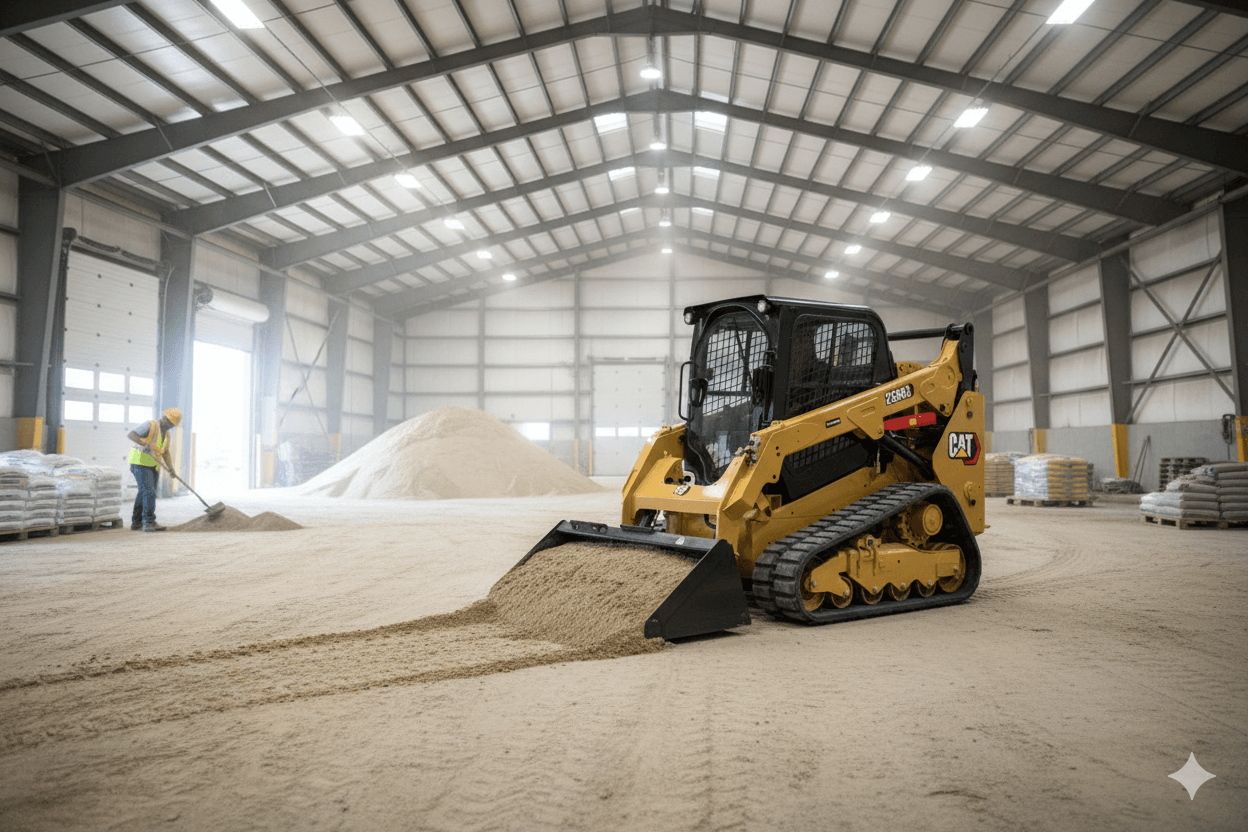 This machine is a CAT compact track loader (CTL), a tracked version of a skid steer designed for powerful earthmoving and construction work. It features a fully enclosed operator cab, hydraulic loader arms, and a universal quick-attach front bucket suitable for grading, digging, loading, and site preparation.